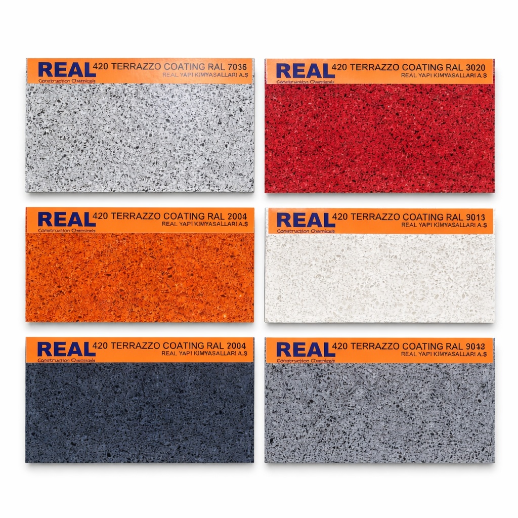 REAL 420 Epoxy Terrazzo, epoksi reçine ile cam ve kum tanelerinin bir araya getirilmesiyle geliştirilmiş, reçine esaslı zemin kaplama sistemidir. Yarı parlak görünüme sahiptir ve katalog renklerinde uygulanabilir. Sistem, uygun yüzey hazırlığı ve katmanlı uygulama adımlarıyla yüksek dayanım, estetik terrazzo dokusu ve uzun ömürlü kullanım hedefler. Uygulama sonrası elmas silim ile terrazzo dokusu ortaya çıkarılır ve koruyucu kat (alifatik poliüretan cila) ile yüzeyin leke direnci, UV dayanımı ve renk stabilitesi iyileştirilir.